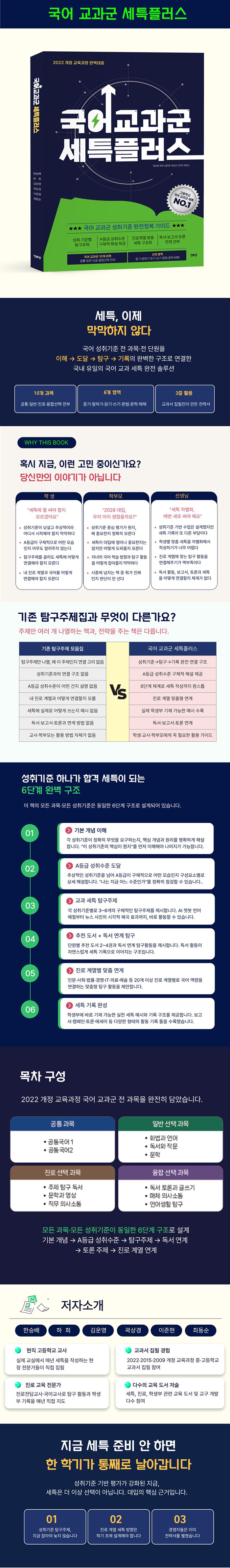 <국어교과군 세특플러스>는 이러한 교육과정의 변화와 학교 현장의 고민에서부터 출발했다. 기존 탐구주제 모음집의 틀에서 벗어나, 2022 개정 교육과정의 모든 국어 성취기준을 ‘이해 → 도달 → 탐구 → 기록’의 완벽한 구조로 연결한 ‘국내 유일의 국어 교과 세특 가이드북’으로 완성됐다.