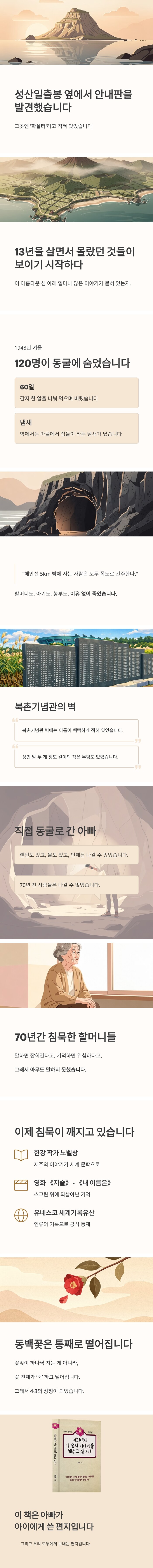전 9장과 부록으로 구성된 이 책은 단순한 역사 서술이 아니다. 동굴에서 60일간 감자 한 알로 버틴 120명의 이야기, 70년간 침묵을 강요당한 할머니들, 바다를 건너 일본으로 도망친 재일제주인, 그리고 한강 작가의 노벨상과 유네스코 세계기록유산까지 — 과거와 현재를 잇는 기억의 이야기를 담았다.