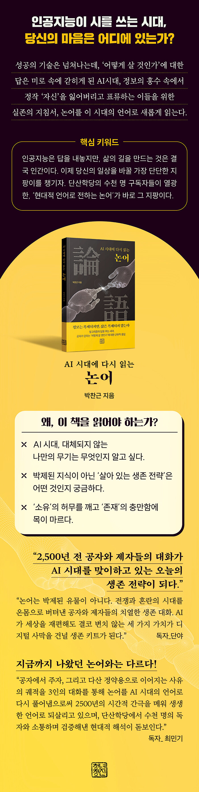 인공지능은 텍스트를 분석하지만 진심을 공감하지 못하며, 규칙을 지키지만 존중을 느끼지 못한다. 저자는 기술이 인간의 지능을 추월할 때 우리가 끝까지 붙들어야 할 것은 결국 ‘사람을 향한 예우(禮)’, ‘나를 이기는 절제(克己)’, ‘타인을 헤아리는 마음(恕)’이라고 역설하면서, 다시 길 위에 서는 당신에게 “이제 책장을 덮으십시오. 그리고 당신의 일상이라는 새로운 논어를 쓰십시오.”라고 당부하는 것으로 마침표를 찍는다.