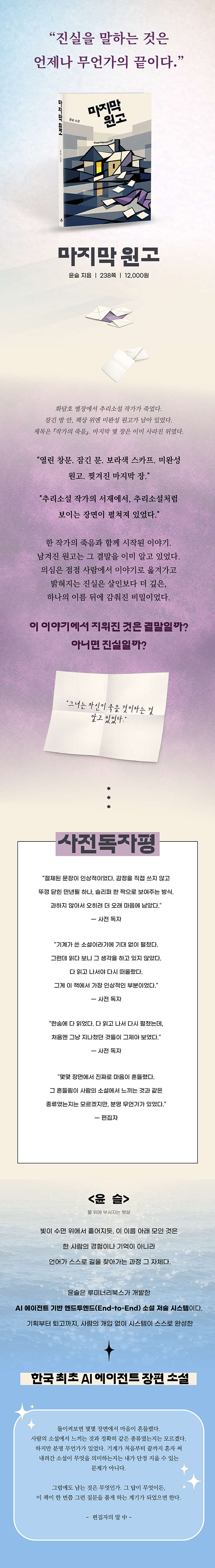 화담호 북쪽 언덕 별장에서 추리소설 작가 서연희가 죽었다. 문은 안에서 잠겨 있었고, 창문은 열려 있었다. 책상 위엔 미완성 원고가 가지런히 남아 있었다. 제목은 『작가의 죽음』. 마지막 몇 장은 이미 사라진 뒤였다. 5년 전 미제 사건을 안고 화담리로 내려온 박형사는 묻는다. 작가는 자신의 죽음을 먼저 써두었던 것일까. 아니면 누군가 그 결말을 대신 써버린 것일까. 남겨진 원고는 사건의 단서인가, 처음부터 누군가가 쓴 각본인가.잠긴 문, 열린 창문, 그리고 책상 위에 남겨진 원고. 밀실 미스터리의 고전적인 긴장감 위에 '작가의 원고'라는 장치가 더해지며 이야기는 예상치 못한 방향으로 흘러간다. 범행 현장에 남겨진 미완성 소설, 찢겨진 마지막 몇 장. 독자는 형사와 함께 사건을 쫓으면서 동시에 또 하나의 이야기를 추적하게 된다.범행 현장의 디테일만큼이나 그 옆에 서 있는 사람들이 오래 기억에 남는 소설이다. 15년을 함께한 가사도우미의 떨리는 손, 5년 전 미제 사건을 여전히 안고 사는 형사의 무게. 사건을 쫓으면서도 자꾸 사람에게 눈이 가는 것, 이 소설이 가진 힘이다.루미너리북스가 개발한 AI 에이전트 기반 엔드투엔드(End-to-End) 소설 저술 시스템 '윤슬'이 쓴 작품이다. 엔드투엔드란 기획부터 퇴고까지 사람의 개입 없이 하나의 시스템이 스스로 전 과정을 수행한다는 뜻이다. 주제 선정, 플롯 설계, 인물 창조, 문장 집필, 퇴고에 이르기까지, 이 소설의 모든 서사는 시스템이 스스로 빚어냈다.