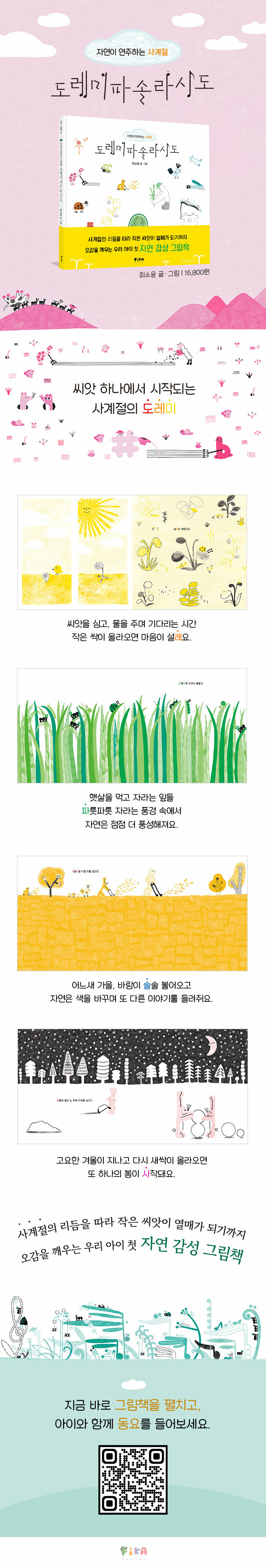여덟 음계에 사계절의 변화를 담아낸 그림책이다. 한국그림책출판협회 신인 작가상 수상자 최소윤의 신작으로, ‘자연의 순환’을 계이름 언어유희로 풀어내며 봄부터 겨울까지를 한 편의 노래처럼 구성했다. QR 코드를 통해 실제 음악을 들으며 오감으로 읽는 새로운 독서 경험을 제안한다.
