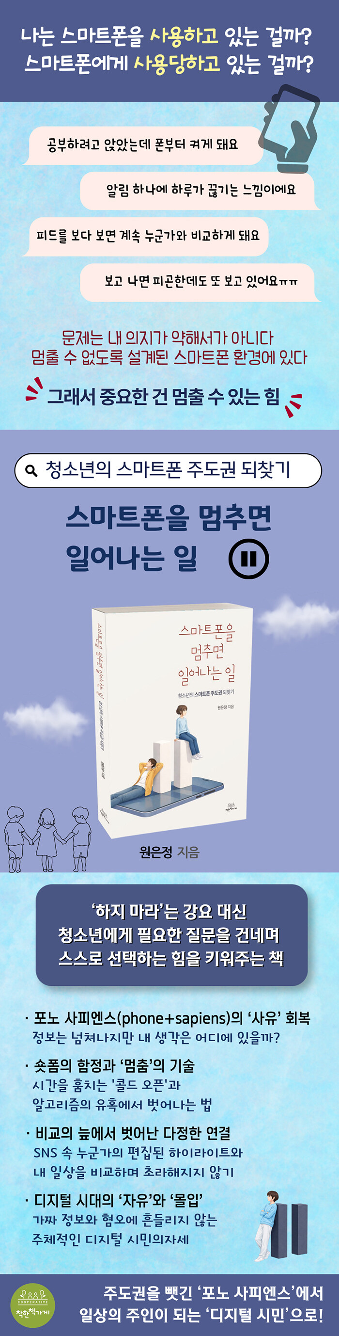 청소년을 위한 책, 그러나 모두를 위한 질문이 책은 청소년을 주요 독자로 삼고 있지만, 스마트폰과 함께 살아가는 모든 세대에게 던지는 질문이기도 하다. 이 책은 이렇게 묻는다. “지금 나는 선택하고 있는가, 아니면 끌려가고 있는가?” 그리고 그 질문은 결국 한 문장으로 이어진다.