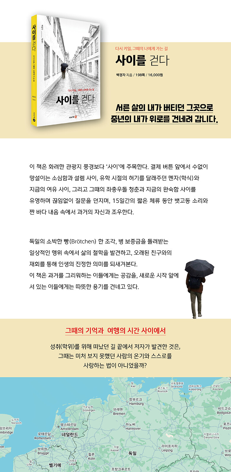 이 책은 화려한 관광지 풍경보다 ‘사이’에 주목한다. 결제 버튼 앞에서 수없이 망설이는 소심함과 설렘 사이, 유학 시절의 허기를 달래주던 멘자(학식)와 지금의 여유 사이, 그리고 그때의 좌충우돌 청춘과 지금의 완숙함 사이를 유영하며 끊임없이 질문을 던지며, 15일간의 짧은 체류 동안 뱃고동 소리와 짠 바다 내음 속에서 과거의 자신과 조우한다. 독일의 소박한 빵(Brotchen) 한 조각, 병 보증금을 돌려받는 일상적인 행위 속에서 삶의 철학을 발견하고, 오래된 친구와의 재회를 통해 인생의 진정한 의미를 되새겨본다. 이 책은 과거를 그리워하는 이들에게는 공감을, 새로운 시작 앞에 서 있는 이들에게는 따뜻한 용기를 건네고 있다.