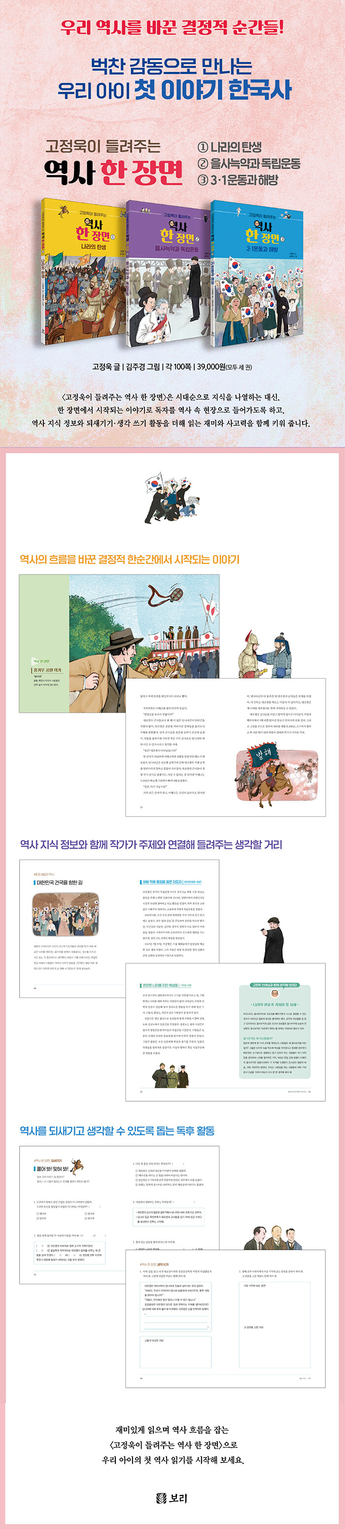 세 권을 따라가며 한국사의 큰 줄기를 자연스럽게 익히다1권 《나라의 탄생》은 발해, 고려, 조선 건국을 통해 새로운 나라가 어떻게 시작되었는지 보여 줍니다. 더 나은 세상을 바라던 백성의 열망과 시대의 흐름이 어떻게 새로운 지도자와 새로운 나라를 탄생시켰는지 읽는 동안 자연스럽게 이해하게 됩니다. 2권 《을사늑약과 독립운동》은 외교권과 주권을 빼앗긴 대한제국의 몰락과, 그 뒤를 이은 독립운동가들의 처절한 희생을 한 장면으로 그립니다. 을사늑약, 안중근 의거, 윤봉길 의거를 통해 빼앗긴 나라를 되찾으려는 독립운동가들의 결의와 민중의 의지를 강하게 전합니다. 3권 《3·1운동과 해방》은 3·1운동의 만세 함성, 베를린 올림픽 마라톤에서 금메달을 따고도 일장기를 가려야 했던 손기정의 슬픔, 마침내 거리로 쏟아져 나온 해방의 태극기까지 담아, 독립의 불꽃이 어떻게 광복의 기쁨으로 이어졌는지 보여 줍니다.
