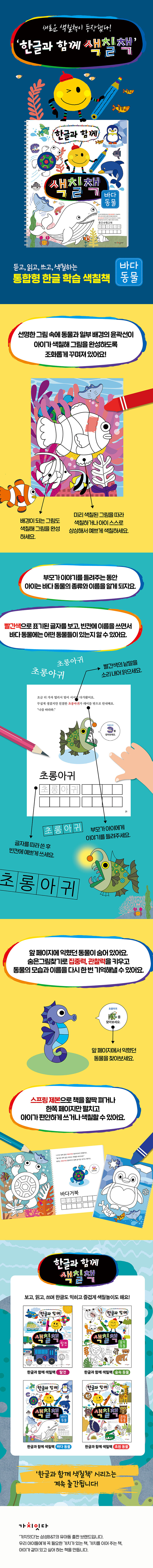 선명하고 생동감 넘치는 일러스트와 함께 바다거북, 돌고래, 펭귄, 흰긴수염고래, 복어 등 다양한 동물을 익힐 수 있다. 스프링 제본으로 편하게 펼쳐 쓰고 색칠할 수 있으며, 완성한 그림을 활용하는 즐거움까지 더해 한글 학습과 놀이를 함께 경험하게 하는 색칠책이다.