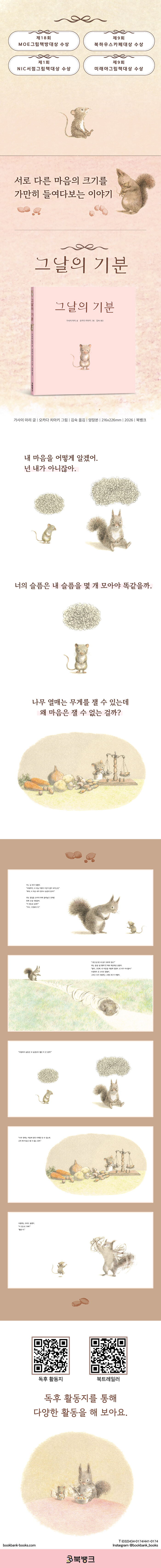 서로 다른 마음의 크기를 가만히 들여다보는 이야기. 제18회 MOE그림책방대상 등 여러 그림책상을 수상한 『그날의 기분』은 나무 열매는 무게를 잴 수 있지만 마음은 잴 수 없다는 질문에서 출발해, 서로의 감정을 이해하려는 과정을 섬세하게 그려낸다. 말로 꺼내지 않아도 알아주길 바라지만 쉽게 닿지 않는 마음의 거리 속에서 우리는 끊임없이 서로를 헤아리려 한다.
