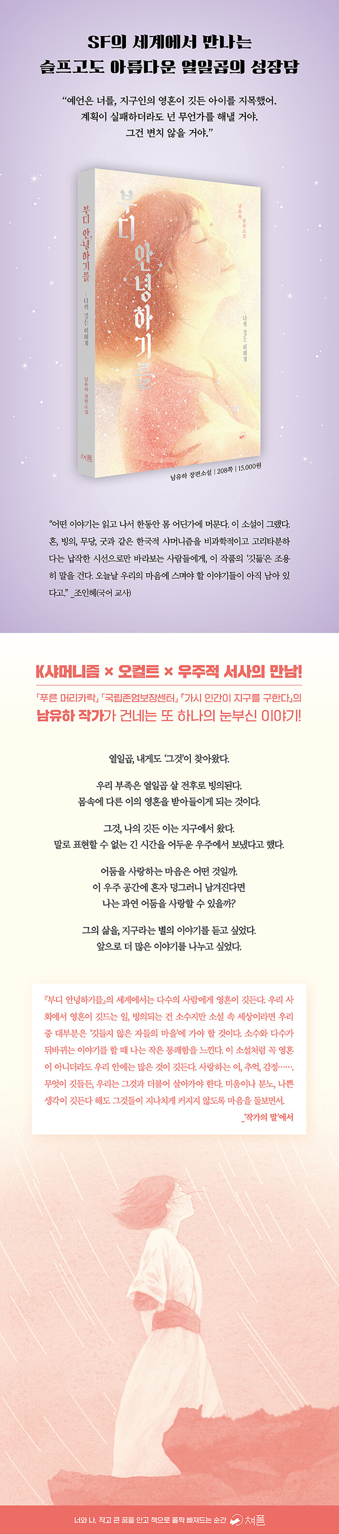 떨쳐 낼 수 없는 기쁨과 슬픔 둘 다를 가슴속에 품고 뜨겁게 이야기를 써 내려간 듯한 남유하 작가. 그는 한 사람이 생애 전반에 마주하는 ‘성장’의 변곡점을 탁월하게 포착하며 먹먹한 감동을 독자들에게 선사한다. 무엇보다, 작품에 담긴 다채로운 이야깃거리 – 무속 신앙, 보편성, 다수와 소수, 차별과 배제, 우정과 포용 – 를 살펴보는 것만으로도 읽는 즐거움이 풍성해질 것이다. 책장을 덮으며 사랑하는 이의 안부를 고요히 읊조리게 되는 이 아름다운 세계에 부디, 우리 함께 깃들 수 있기를.