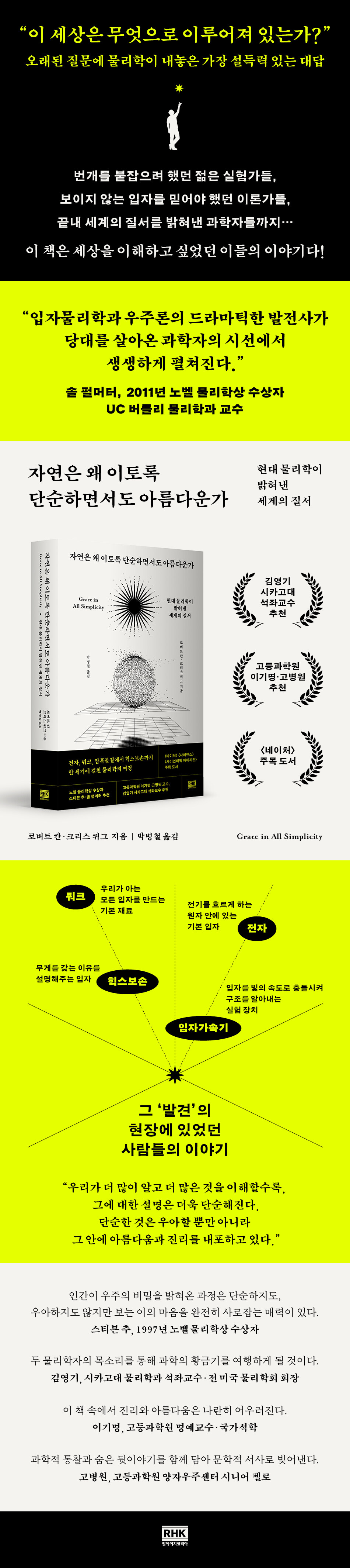 노벨 물리학상 수상자인 스티븐 추(1997)와 솔 펄머터(2011)를 비롯해 전 미국 물리학회 회장을 역임한 시카고대 김영기 석좌교수, 고등과학원 이기명, 고병원 교수의 추천사는 이 책에 권위를 더한다. 독자들은 놀랄 만큼 단순한 법칙 위에 세워진 세계에서 깊은 아름다움과 밝혀지지 않은 신비를 찾는 과학자들의 지적 모험이 얼마나 매혹적인지를 느끼게 될 것이다.