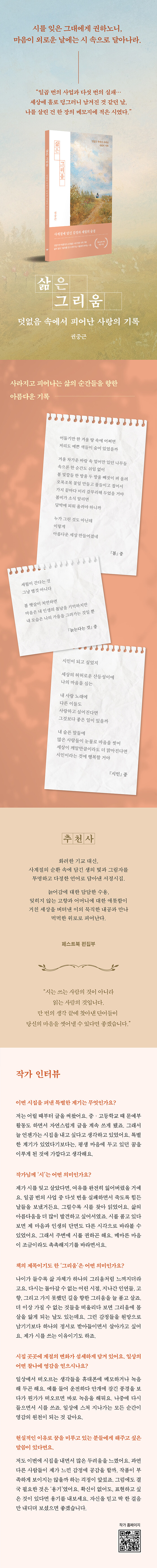 이 시집은 한 시인의 인생 기록이자 세월의 사유록이다. <그리움>, <그대가 없는 새벽>, <늙는다는 것>에서 이어지는 시간의 서사는 사랑과 상실, 회한과 수용이 맞물려 흐른다. 시를 읽는 동안 독자는 자신의 기억 속으로 천천히 걸어 들어가며, 잊었던 감정의 잔향과 마주하게 된다. 『삶은 그리움』은 결국 우리 모두의 이야기다. 사라지고 피어나고, 또다시 사라지는 모든 순간 속에서 시인은 말한다. “그리움이야말로 우리가 살아 있다는 증거”라고.