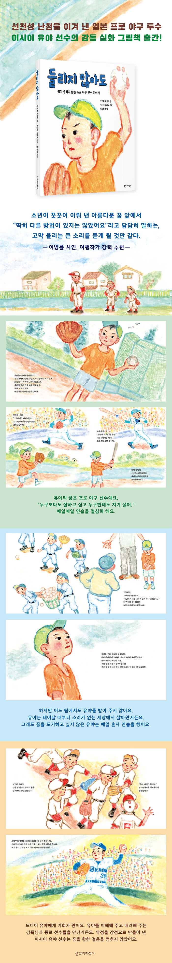 포기하지 않는 마음의 속도로 매일매일 꿈을 향해 한 발짝 내딛기선천적인 청각 장애를 극복하고 일본 프로 야구에서 활약하며 많은 이들에게 감동을 준 투수 이시이 유야 선수의 이야기가 그림책으로 출간되었다. 태어날 때부터 소리를 거의 듣지 못했던 소년이 어떻게 프로 야구 투수라는, 불가능해 보이는 꿈을 이루어 냈는지를 감동적으로 담은 그림책이다. 초등학교 2학년 때 형이 소속된 소년 야구팀에 들어가 야구를 시작한 이시이 유야는 5학년 때 외야수와 투수를 겸했고, 2004년 주니치 드래건스에 입단해 프로 생활의 시작을 알렸다. 그 후 요코하마 베이스타즈, 닛폰햄 파이터스 등에서 투수로 활약했다. 간신히 들리는 희미한 소리에 의지해야 했던 그가, 동료 선수들의 소리를 듣지 못하는 핸디캡을 어떻게 자신만의 무기로 바꾸어 꿈을 이루었는지 어린이들의 눈높이에 맞춰 생생하게 담았다.