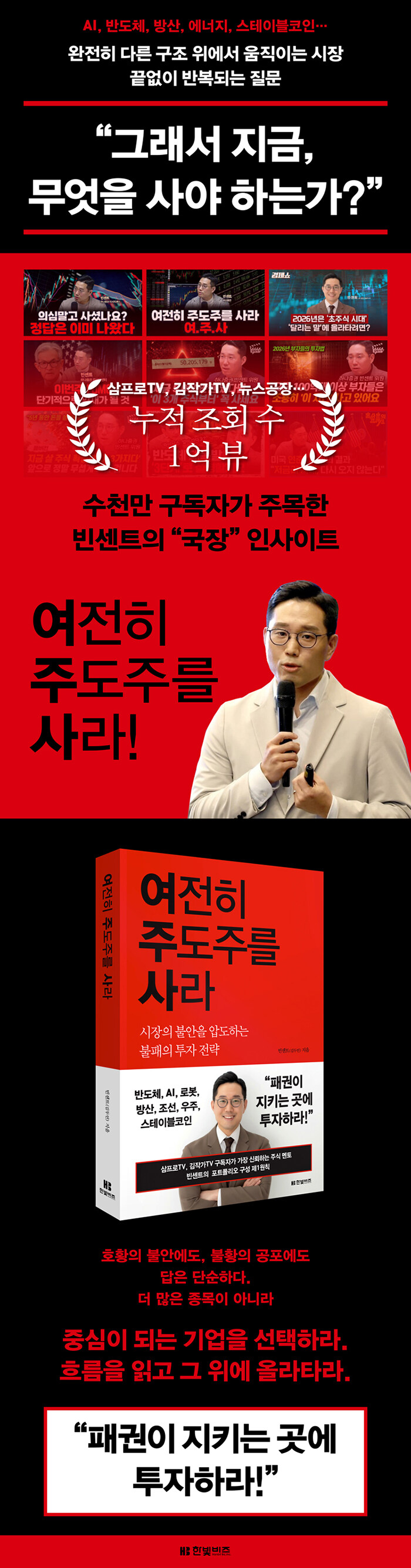 《여전히 주도주를 사라》는 바로 이 지점에서 출발한다. 삼프로TV, 김작가TV 등 다양한 채널을 통해 변화하는 글로벌 질서 속에서 돈의 흐름을 읽는 새로운 투자 프레임을 제시해온 빈센트 하나증권 이코노미스트의 투자 인사이트가 집약된 이 책은 어떤 선택을 해야 하는지, 그 방향을 함께 찾는 이정표가 되어줄 것이다.