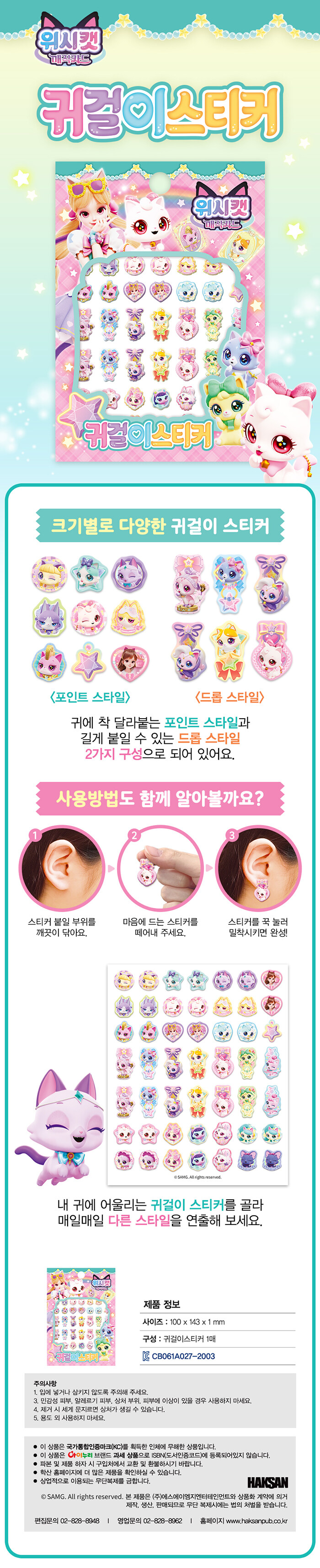 귀에 밀착되어 일상생활에 불편없이 사용이 가능한 붙이는 귀걸이스티커다. 아이들이 귀여운 캐릭터와 아기자기한 그림으로 구성되어 있다. 다양한 귀걸이스티커로 블링블링하게 변신해 보자.