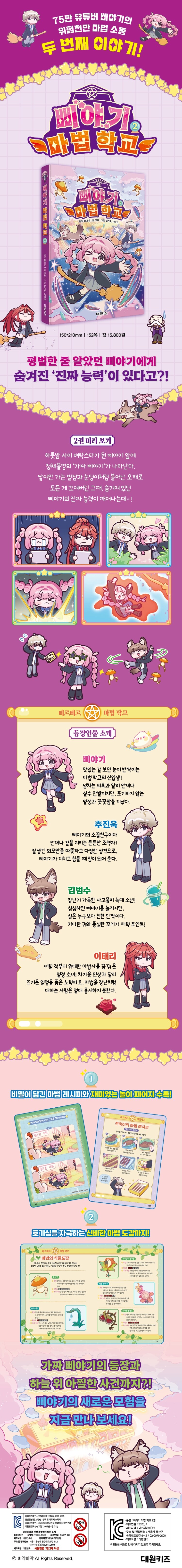 비밀이 가득 담긴 마법 레시피와 재미있는 놀이 페이지는 물론, 알쏭달쏭 신비한 마법 도감까지! 다양한 볼거리와 즐길 거리가 가득 담긴 <삐야기 마법 학교> 2권으로 삐야기와 함께 새로운 모험을 떠나 보세요!