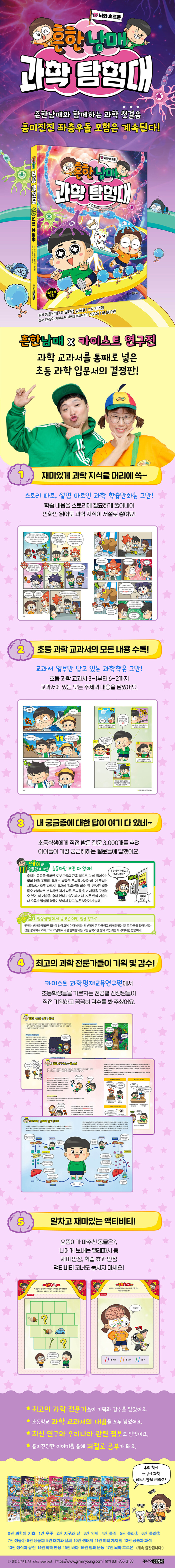 카이스트 연구진과 과학 전공 작가, 스토리 작가가 함께 완성도를 높였고, 3,000여 개 어린이 질문을 반영한 구성과 액티비티까지 더했다. 과학을 처음 배우는 아이들에게 체계적이면서도 친근한 첫걸음을 제시하는 학습만화다.