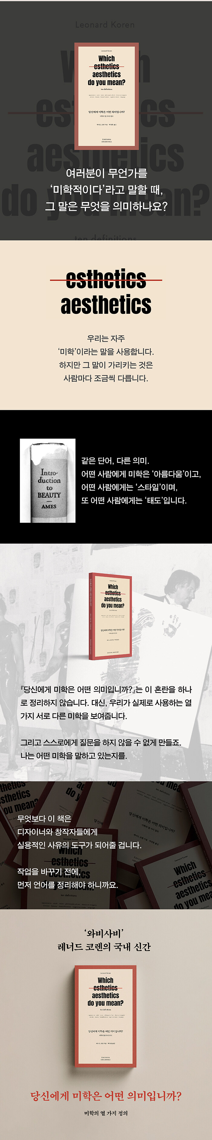 “이 책은 ‘미학적인’ 그리고 ‘미학’의 다양한 의미를 명확히 규정한 다음 특정 상황에 걸맞는 두 단어의 용법을 제시함으로써 의미의 부재와 혼동이라는 표면적인 문제들을 다룬다.”그렇지만 『당신에게 미학은 어떤 의미입니까?』는 단순히 미학을 정의하는 책이 아니다. 오히려 정의하려는 충동을 해체하는 책이다. 그가 제시한 열 가지 서로 다른 방식은, 하나의 정답이 아닌 열 개의 서로 다른 방향이다. 그 사이의 간극에서 독자는 비로소 깨닫게 된다. 미학은 하나의 이론이 아니라, 우리가 세계를 인식하고 배열하는 방식이라는 것을. 와비사비를 통해 ‘불완전함의 아름다움’을 서구에 전했던 코렌은 이번에는 한 걸음 더 나아가 ‘아름다움을 말하는 언어 자체’에 대해 질문을 던지고, 복잡한 이론 대신 짧고 명료한 문장과 직관적인 구성으로 미학이라는 넓은 영역을 새롭게 조망한다. 얇은 이 한 권의 책을 다 읽은 독자들은 다시 같은 질문을 건네 받아 오래 머물게 될 것이다. “당신에게 미학은 어떤 의미입니까?”