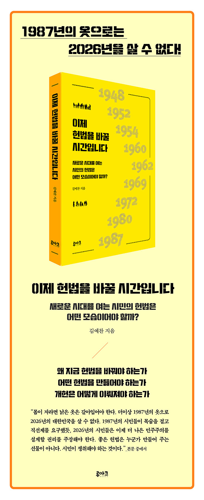 이 책은 87년 체제가 지닌 구조적 한계를 짚어내고, 변화한 시대에 필요한 새로운 권리와 제도를 구체적으로 제시한다. 예컨대 대통령에게 집중된 권한을 분산하기 위한 권력 구조 개편 방안, 시민이 직접 법안을 발의하거나 권력을 견제할 수 있는 국민발안·국민소환제도의 도입 방안, 플랫폼 노동자와 같은 새로운 사회적 주체의 권리를 보장하는 기본권 확대 방안 등이 그것이다. 또 기후위기와 디지털 사회에 대응하기 위한 새로운 권리 규정을 포함해, 변화한 시대에 걸맞은 헌법의 내용을 분야별로 정리해 보여준다. 지은이는 헌법이 더이상 과거의 질서를 유지하는 장치가 아니라, 새로운 사회를 설계하는 틀이 되어야 한다는 점을 분명히 한다.