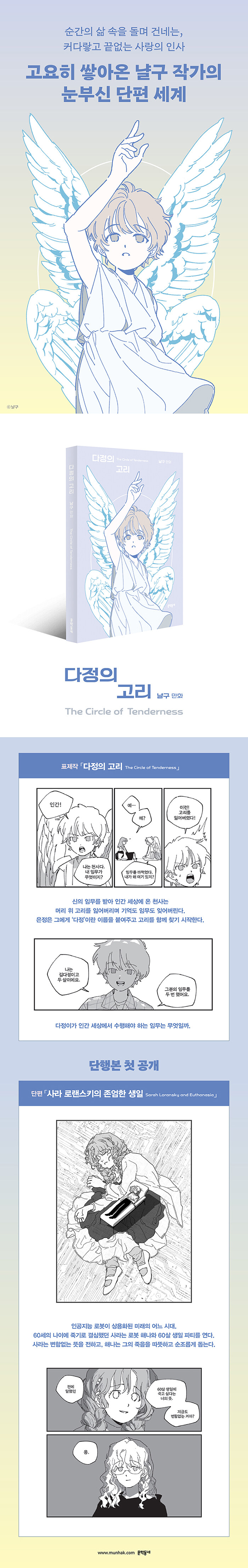 냘구 작가는 그간 독립적인 작품 활동으로 독보적인 단편 세계를 구축해온 만화가다. 불사신과 흡혈귀의 동거 이야기를 그린 『영원한 샘』(장편)에서도 인간이 아닌 두 존재를 통해 영속성과 유한성이라는 가치를 그리며 그것이 때로는 얼마나 무섭고도 신비로운 것인지를 이야기한다. 그 외에도 평온한 일상에 시나브로 펼쳐지는 낯설고 기묘한 사건들을 특유의 절제된 흑백 그림체로 표현하며 환상적인 기담들을 다수 그려왔다. 그런 냘구 작가가 천사와 로봇, 그들과의 만남과 이별을 통해 이야기하려고 한 것은 무엇일까. 그가 그리는 천사는 단순히 사랑스럽고 선량하지만은 않으며, 마찬가지로 그가 그린 로봇은 차갑고 명령어를 수행하는 존재만은 아니다. 전혀 다른 존재들과의 교류를 그린 이야기는 우리를 잠시 다른 곳으로 데려가준다. 비록 아주 짧은 시간이라 할지라도, 나 아닌 다른 존재와 주고받은 마음만은 영원히 고리를 돌듯 순환하며 이어지고 있다는, 삶의 진실 앞으로 우리를 데려다놓는다. “인간이 가지고 있는 가장 따뜻한 감정, 사랑이야”라는 작품 속 대사처럼 그 진실의 온도 역시 얼마나 따뜻한지, 천사의 날개짓과 기계음의 온기가 말해주고 있다.