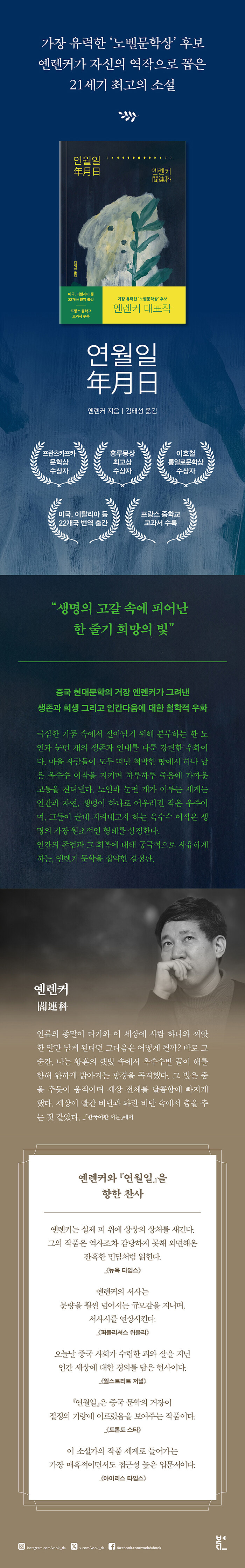 생존과 희생 그리고 인간다움에 대한 철학적 우화 유력한 노벨문학상 후보이자 중국 현대문학의 거장 옌롄커의 대표작 『연월일(年月日)』이 종합 출판 브랜드 ‘북다’에서 새롭게 출간된다. 국내에 처음 소개될 당시에는 다른 중단편 소설과 함께 선집 형태로 묶여 나왔으나, 이번 개정판에서는 작품을 온전히 만날 수 있도록 한 권의 단행본으로 선보인다.
