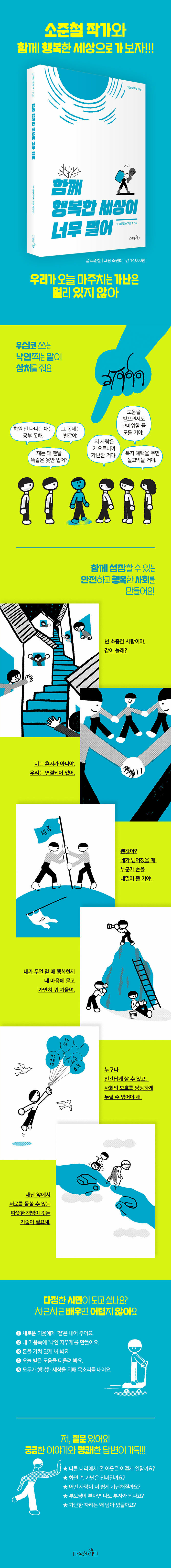 <함께 행복한 세상이 너무 멀어>는 가난 없는 세상, 모두가 함께 행복한 세상을 꿈꾸는 데 도움을 주는 책이다. 이 책에는 빈곤한 나라의 어린이, 도시에 사는 가난, 가난보다 더 무서운 소외, 가난한 사람들에게 더 가혹한 기후 위기, 약자를 외면하는 기술 등에 관한 이야기가 담겨 있다. 차별과 혐오, 소외로 힘든 가난한 사람들의 일상을 보면 이 사회가 얼마나 공정하지 못한지, 약자에게 얼마나 가혹한지 깨닫게 된다. 이제 우리는 가난이 누군가의 잘못이 아니고, 함께 해결해야 한다는 걸 알 수 있다.