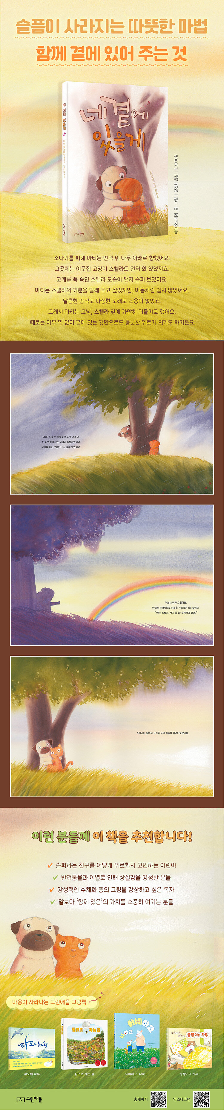 이 책은 ‘슬픔’과 ‘상실’이라는 주제를 캔버스 위에서 부드럽게 번지는 물감처럼 유연하게 풀어냅니다. 소나기가 내린 후 햇빛이 비치며 무지개가 나타나는 모습은 우리 삶에 찾아오는 감정의 파동을 시각적으로 구현해 냅니다. 아무런 말과 특별한 행동을 하지 않고도 그저 나란히 앉아 있는 마티의 모습은 공감이란 ‘상대방의 속도에 나의 시간을 맞추는 일’이라는 것을 깨닫게 합니다. 억지로 슬픔을 몰아내려고 애쓰기보다 젖어 있는 마음이 마를 때까지 곁을 지켜주는 것입니다. 이 침묵의 위로는 ‘펫로스 증후군’을 겪는 반려인들뿐만 아니라 관계의 상처를 입은 모든 이들에게 마법 같은 치유의 순간을 선사합니다. 정해진 정답이 없는 수채화의 여백처럼 독자들은 이 책을 통해 각자의 슬픔을 위로받고 다시 시작할 용기를 얻게 될 것입니다.